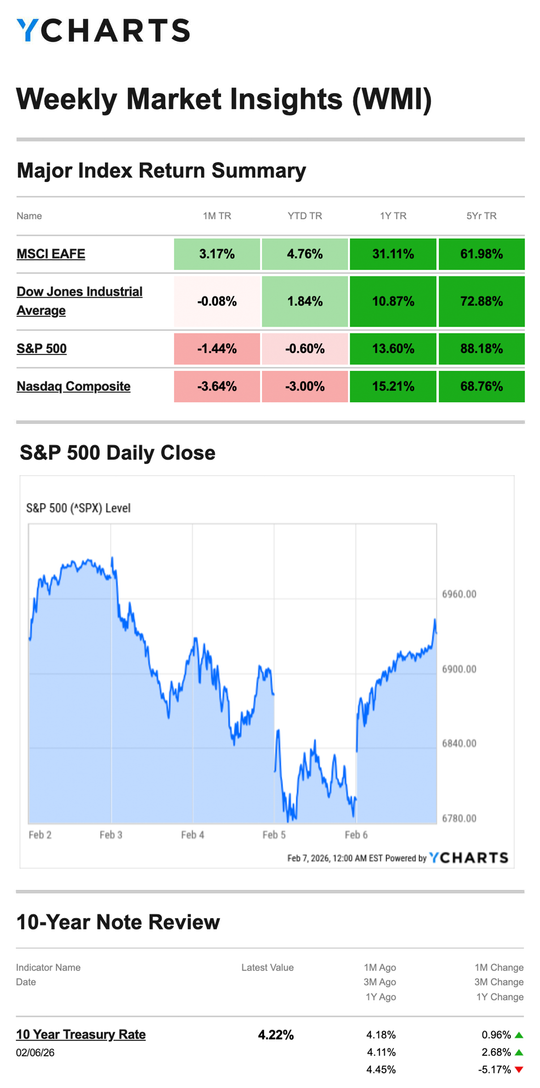 Source: YCharts.com, February 7, 2026. Weekly performance is measured from Monday, February 2, to Friday, February 6. TR = total return for the index, which includes any dividends as well as any other cash distributions during the period. Treasury note yield is expressed in basis points.